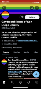I hate seeing this group so much is because it undermines the youth of young people who want to transition or take puberty blockers for ones that have gender dysphoria, and they have depression and I worry about these kids who want to cause self harm because they are not getting the care that they need because of these right wing conservative dip shits who don’t fucking get that and then they’re calling people groomers which is fucking absurd and then you have these dip shits like these gay Republicans from San Diego and then these idiots on Twitter. apparently Anthony Bourdain second wife follows that account.